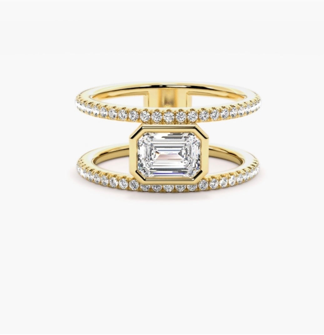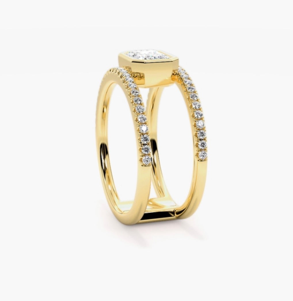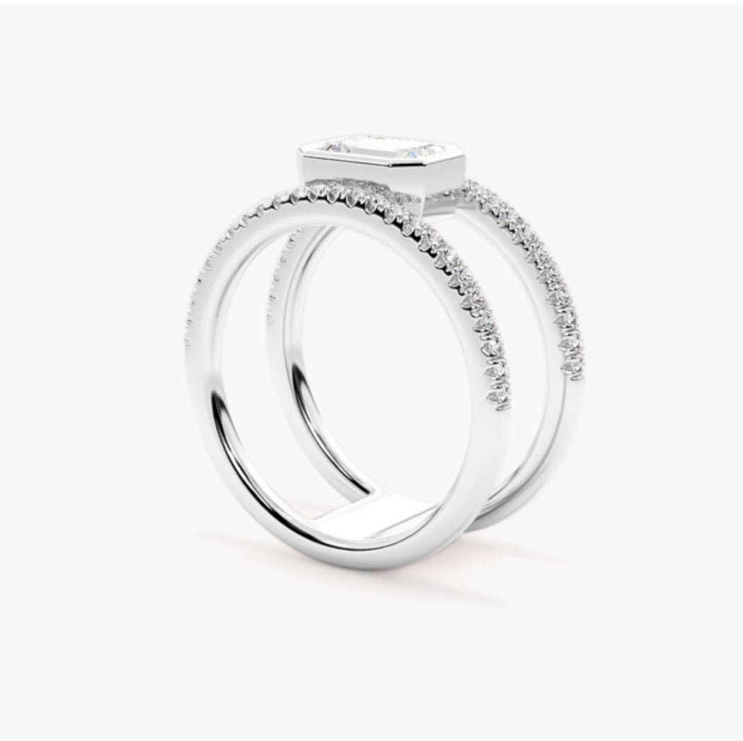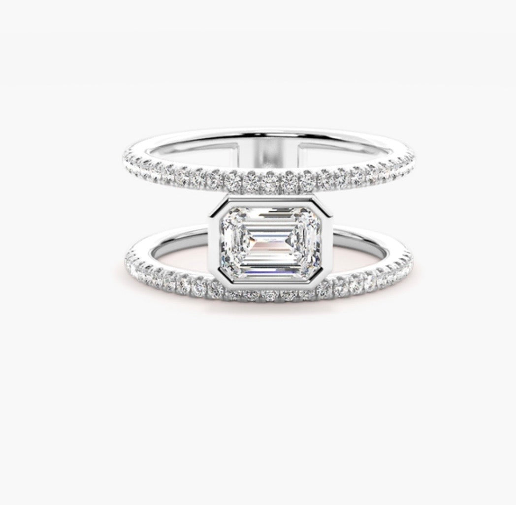 Created to fit any ring size for the ideal, comfortable fit. This piece features a refined double-band accented withΒ pavΓ©-set diamonds along both sides, and a bezel encasement for the centre diamond.