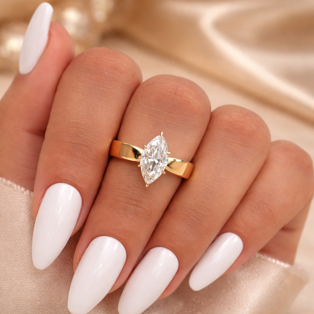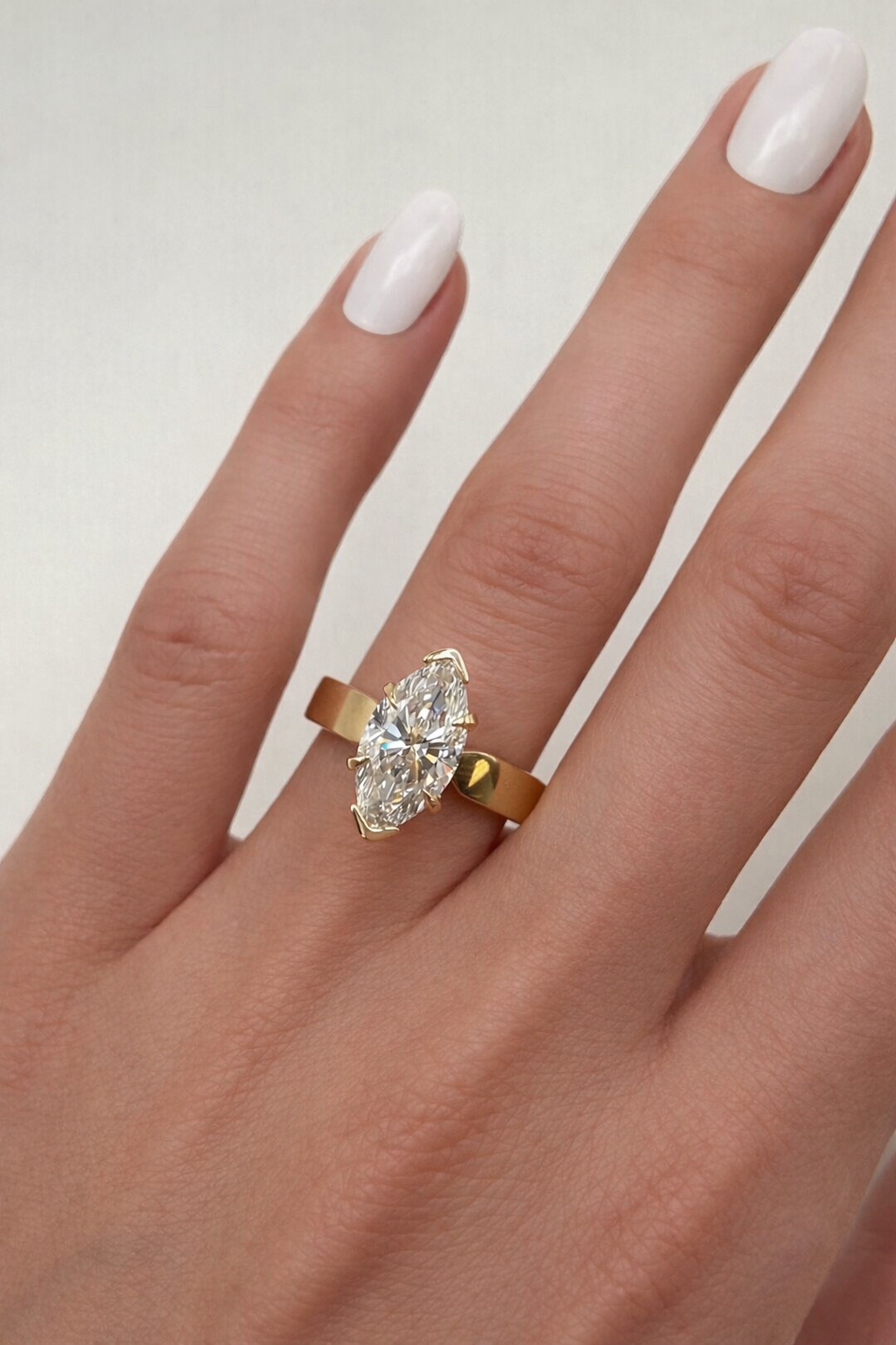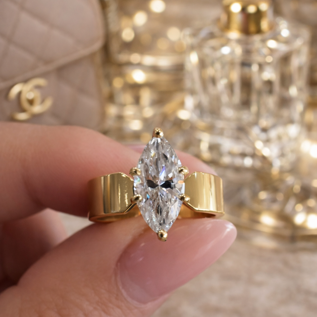 A contemporary interpretation of the classic cigar band, this ring is crafted in solid gold with a flat, architectural profile and a refined high-polish finish. The band tapers inwards towards the centre diamond, creating a statement ‘pinching’ effect. Clean lines and generous proportions give the design a sense of weight and permanence, while its minimalist silhouette keeps it effortlessly elegant.