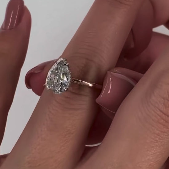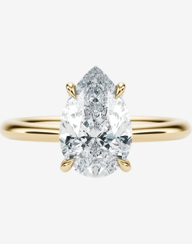 Band:Β Crafted to fit any ring size for the ideal, comfortable fit. This piece features an elevated solitaire style pear shape diamond, on an 18ct gold band delicately secured in a four-claw mount, with a hidden halo.Β