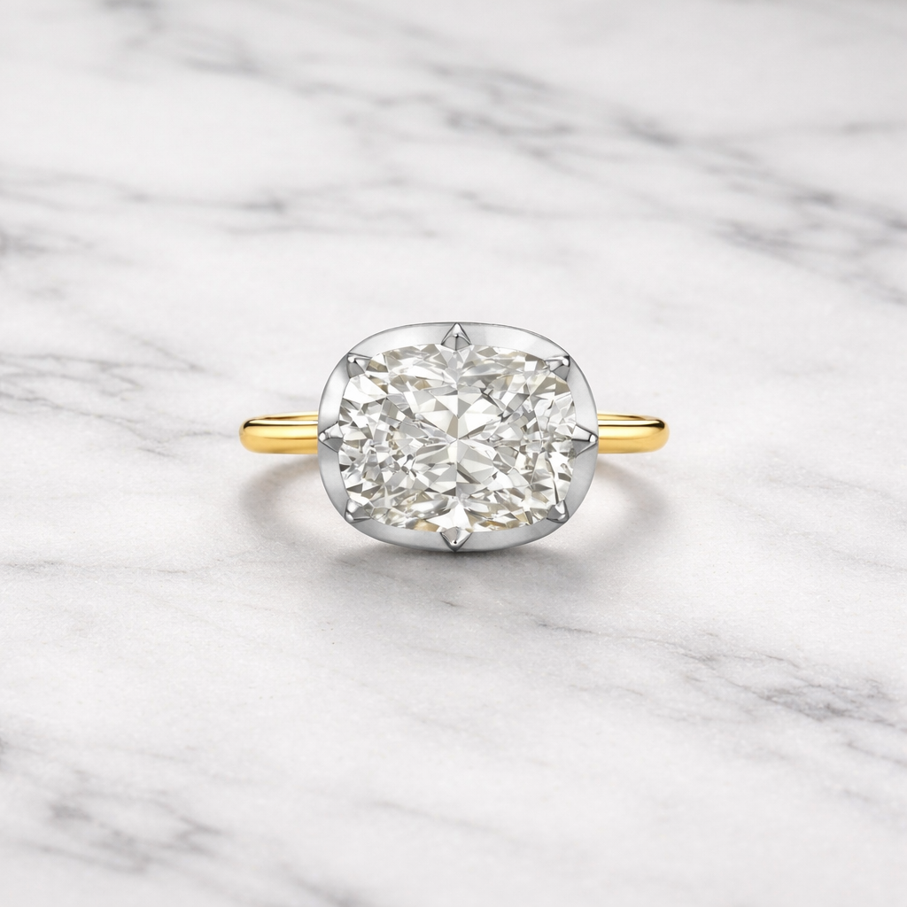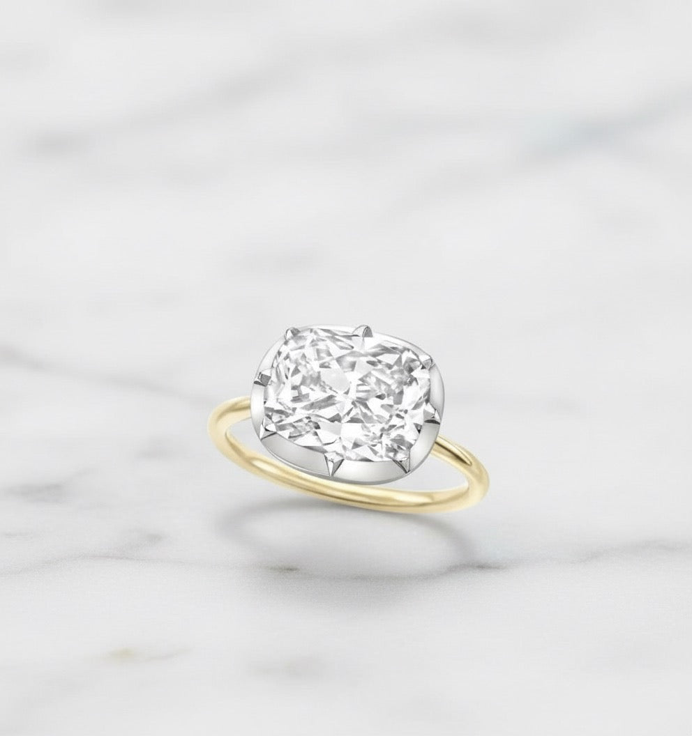 Band:Β A Georgian-inspired cushionΒ diamond,Β framed in a timeless collet bezel, set East-West