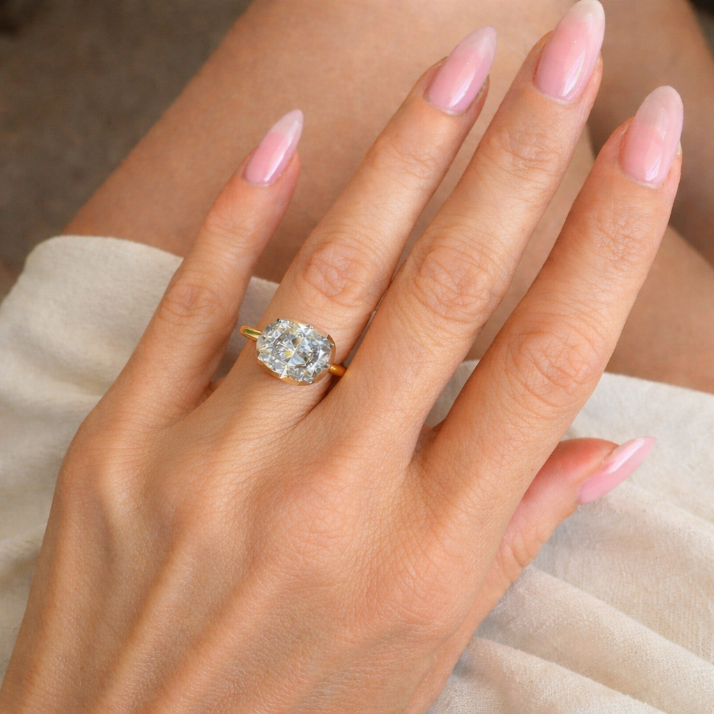 Crafted to sit gracefully on the hand, the collet frame allows light to move fluidly through the diamond, revealing depth, fire, and individuality from every angle. Uncomplicated yet deeply expressive, this is a ring for someone who values subtle drama, thoughtful design, and jewellery that feels uniquely their own rather than traditionally expected.