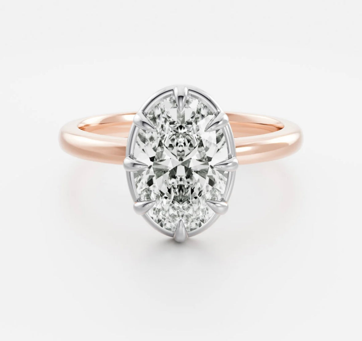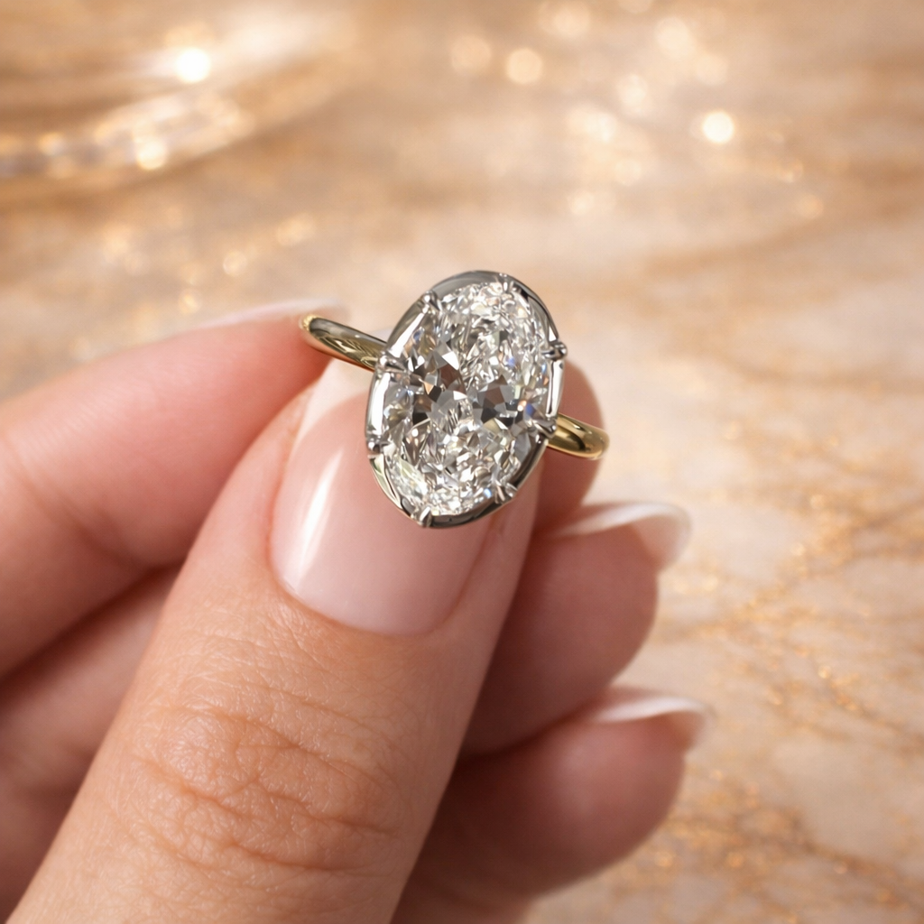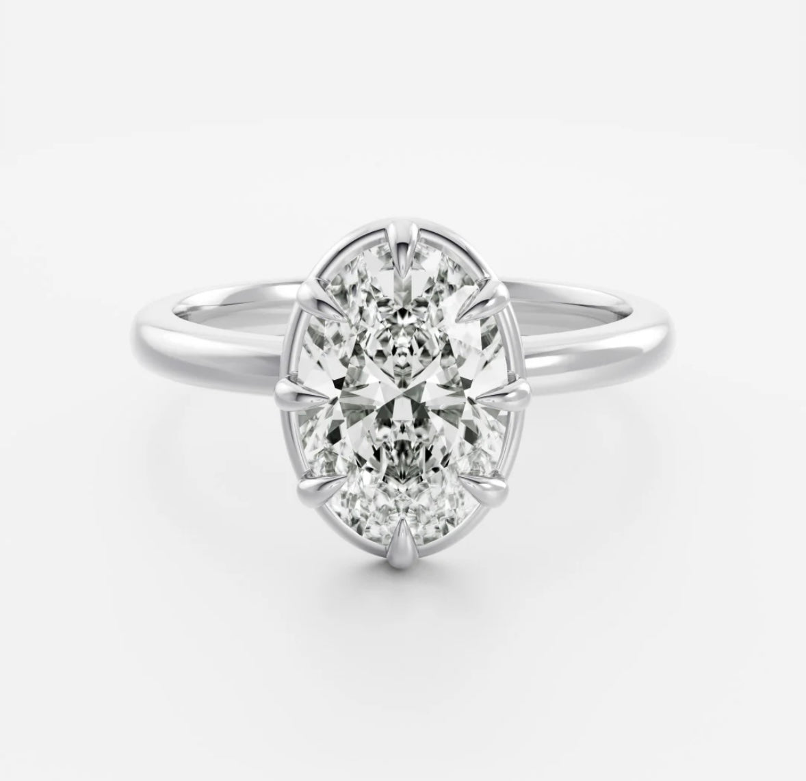 Band:Β A Georgian-inspired ovalΒ diamond,Β framed in a timeless collet bezel.