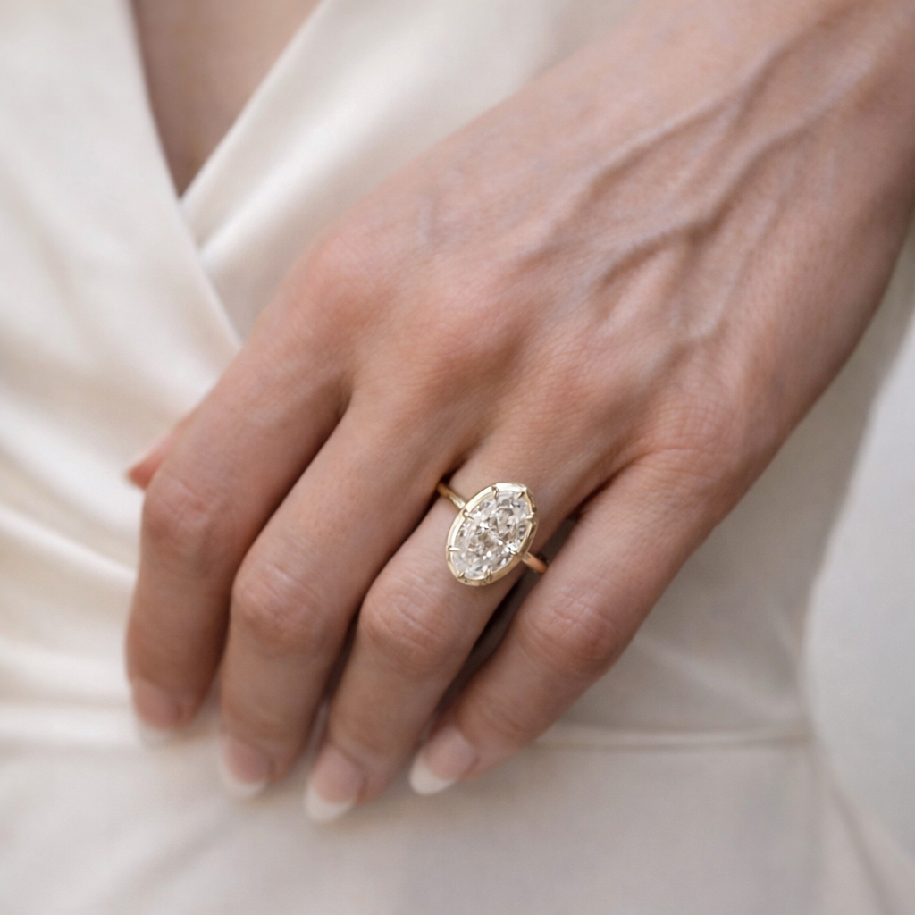 This striking ring celebrates the natural elegance of the oval cut, its elongated silhouette softly embraced by a refined bezel that enhances brilliance while lending a sense of quiet strength. The setting draws from Georgian design principles, reinterpreted with modern restraint to create a piece that feels both storied and distinctly personal.