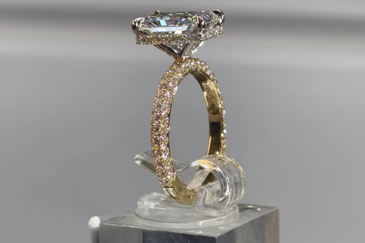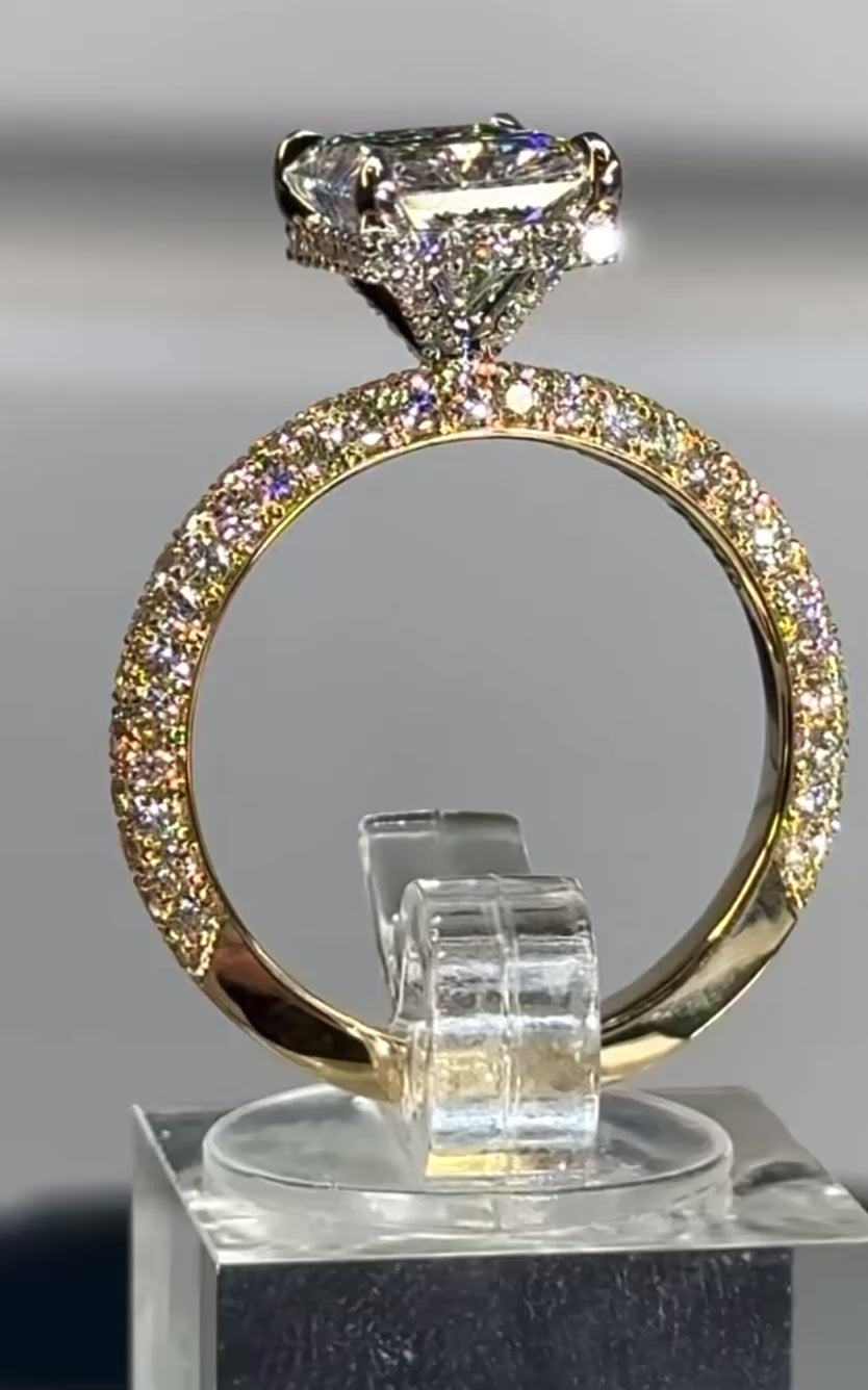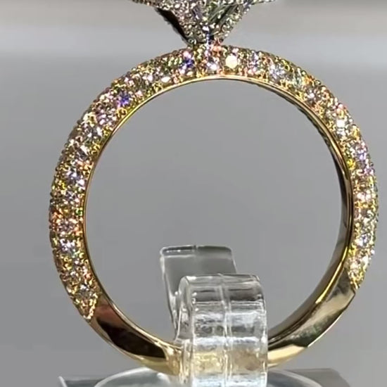 Band:Β Crafted to fit any ring size for the ideal, comfortable fit. This piece features a classic solitaire style on an 18ct gold band with a white gold claw setting and hidden halo. The band is meticulously adorned withΒ pavΓ© set diamonds on all sides, extending three-quarters of the way down for uninterrupted brilliance and a truly luxurious finish.