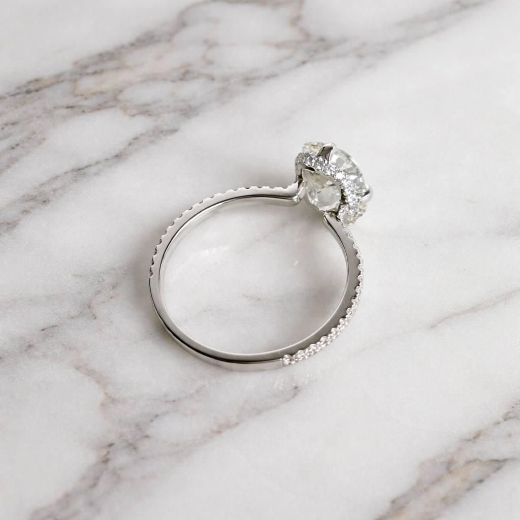 Band:Β Crafted to fit any ring size for a flawless, comfortable fit, this exquisite design showcases a floating Old Mineβcut diamond secured in a refined four-prong compass setting. Celebrated for its candlelight glow, the antique-inspired cut features bold, hand-faceted planes that produce a soft, romantic brilliance reminiscent of diamonds by firelight. A hidden diamond halo subtly enhances the centre stone from beneath, while a delicate pavΓ© band set three-quarters of the way around.