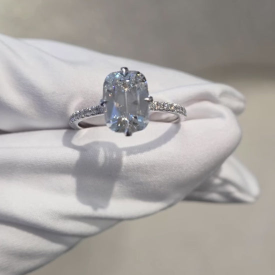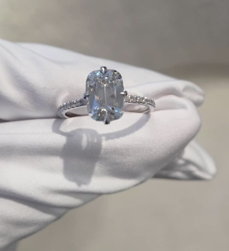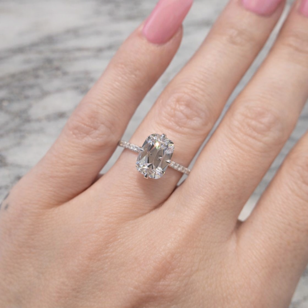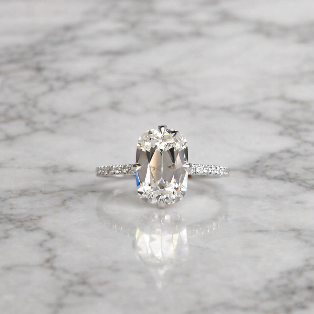 Diamond: ElongatedΒ cushion-old mine cut / candlelight diamond (3ct pictured)