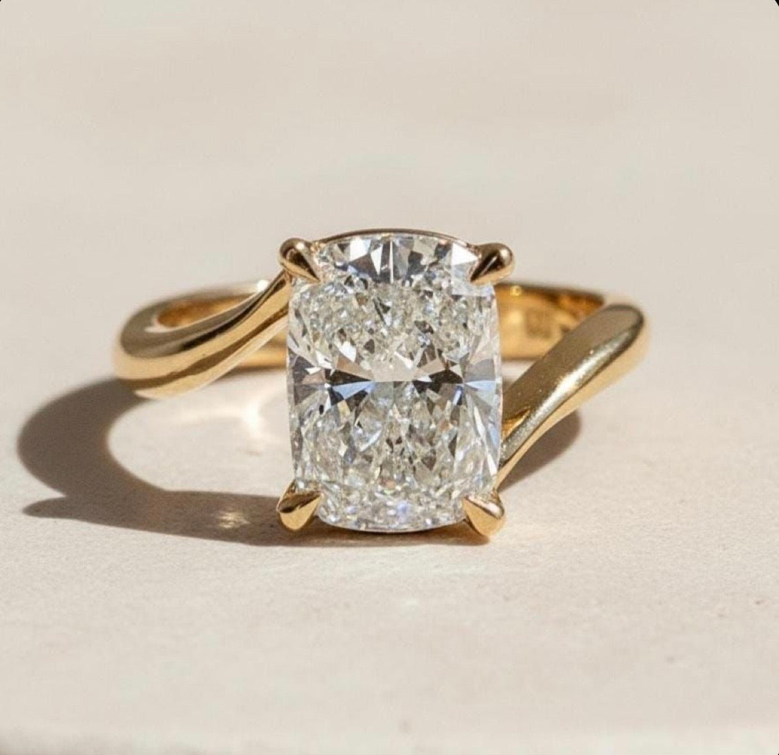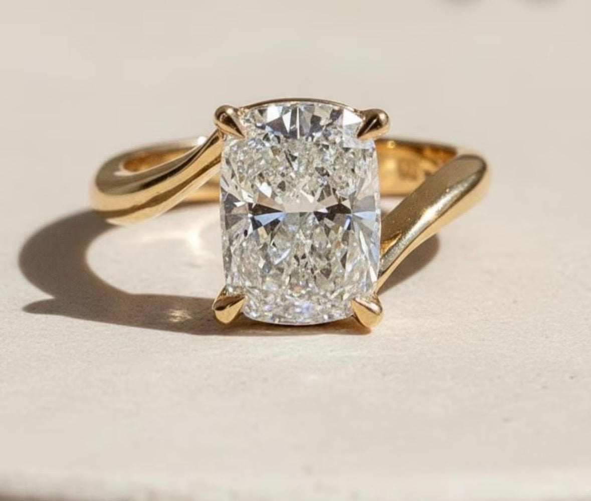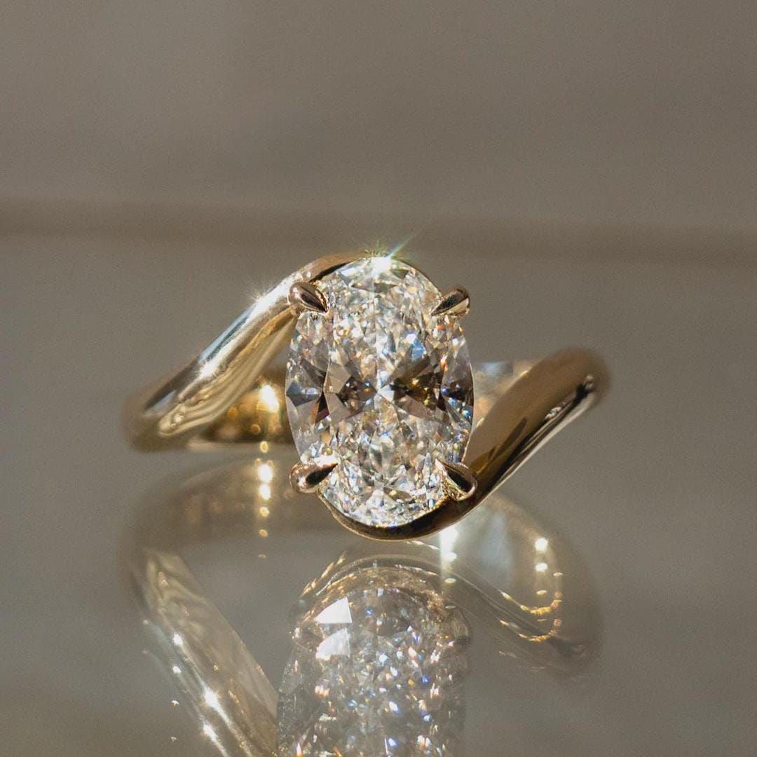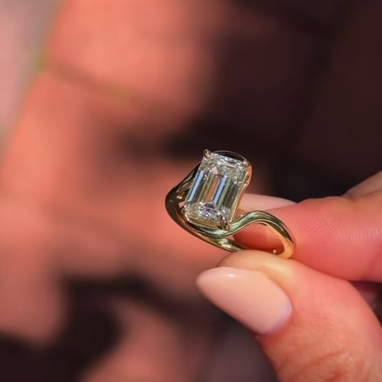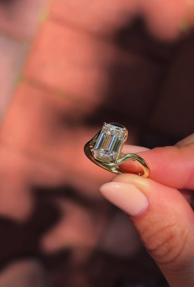 The unique twisted gold band creates an elegant embrace around the finger, while four prongs securely showcase the diamond's exceptional brilliance. This piece perfectly balances timeless elegance with contemporary design.