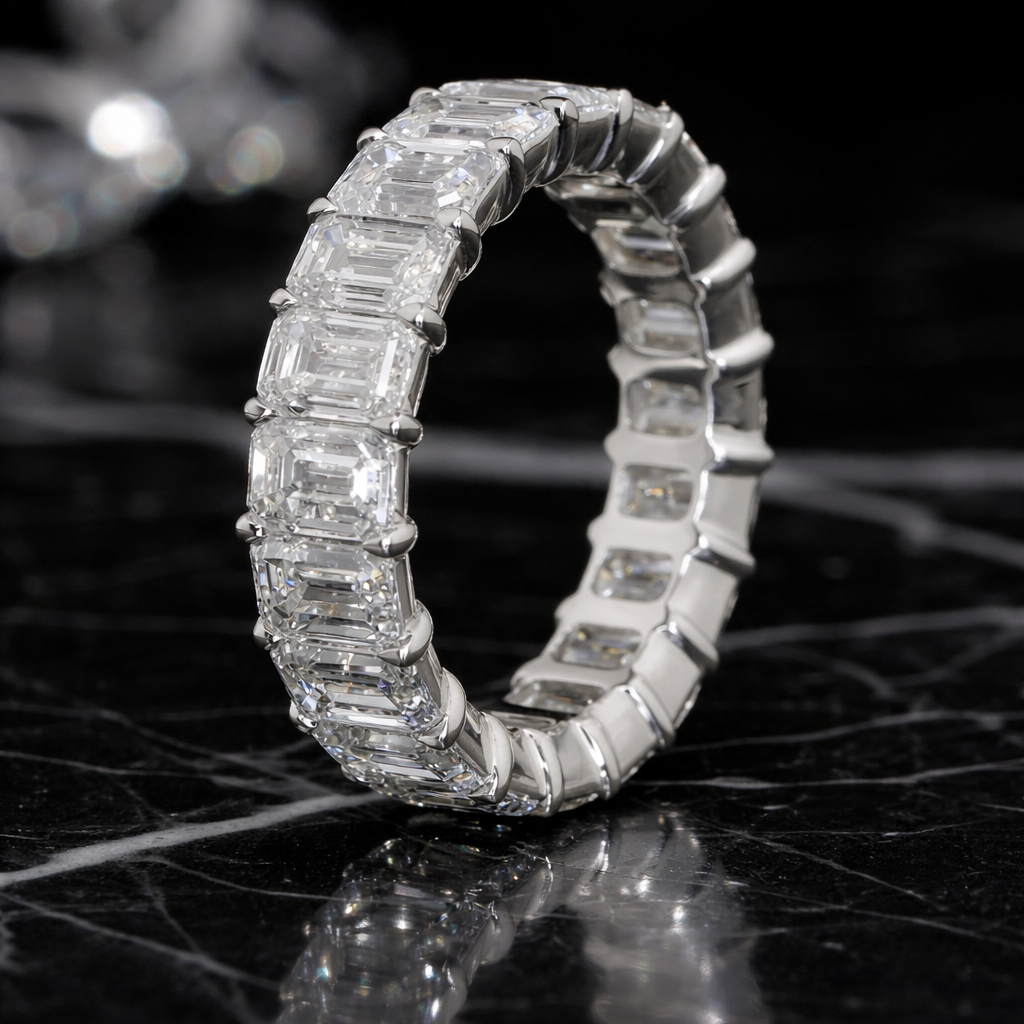 Band: This band features aΒ straight-edged profile where each diamond is framed in a more structured setting. This creates a sleek, contemporary look with strong lines and a bold presence on the finger. The diamonds sit securely and uniformly, offering a modern, architectural aesthetic that feels polished and confident.