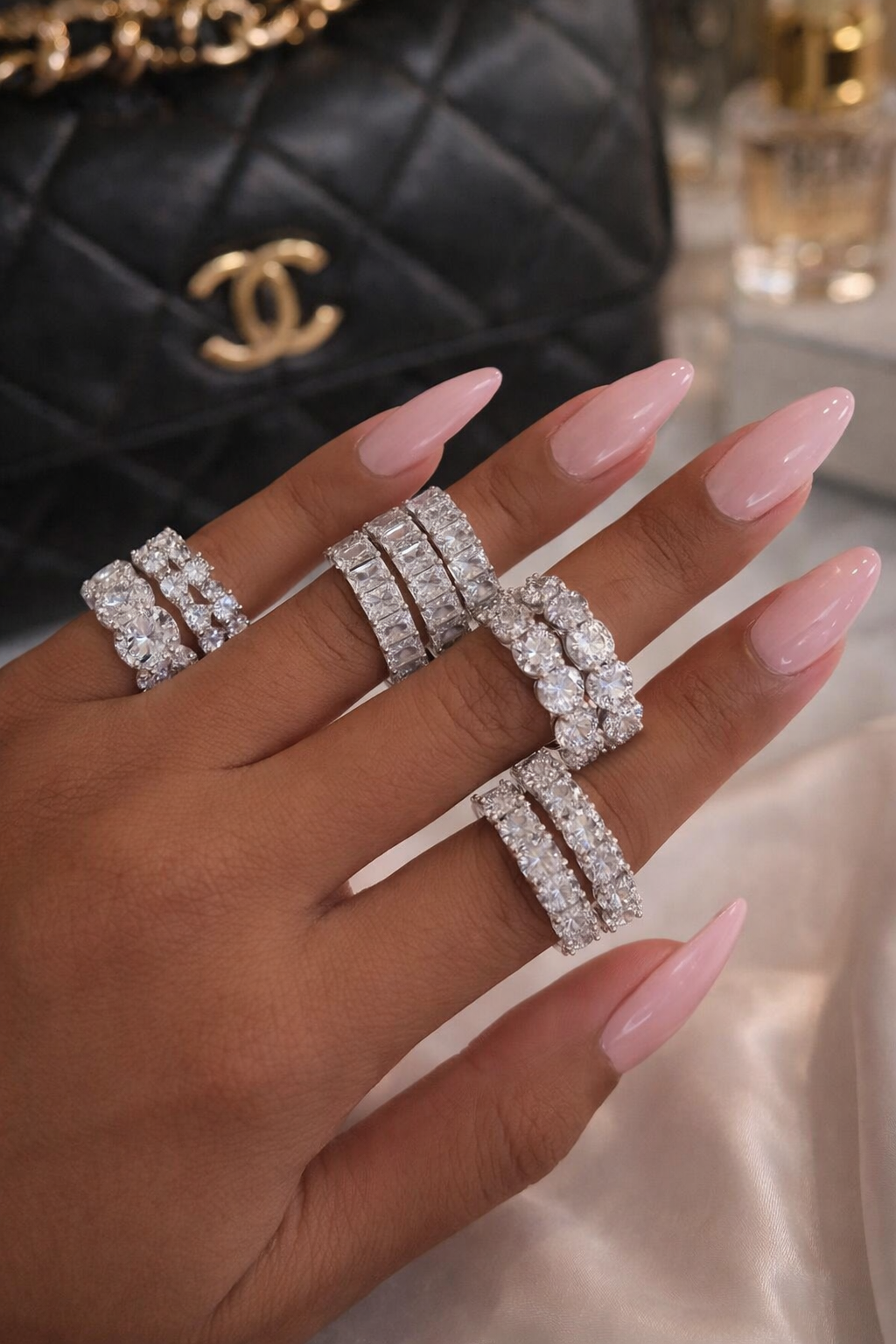 Band: This band features aΒ straight-edged profile where each diamond is framed in a more structured setting. This creates a sleek, contemporary look with strong lines and a bold presence on the finger. The diamonds sit securely and uniformly, offering a modern, architectural aesthetic that feels polished and confident.