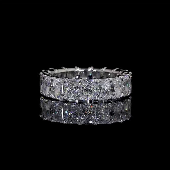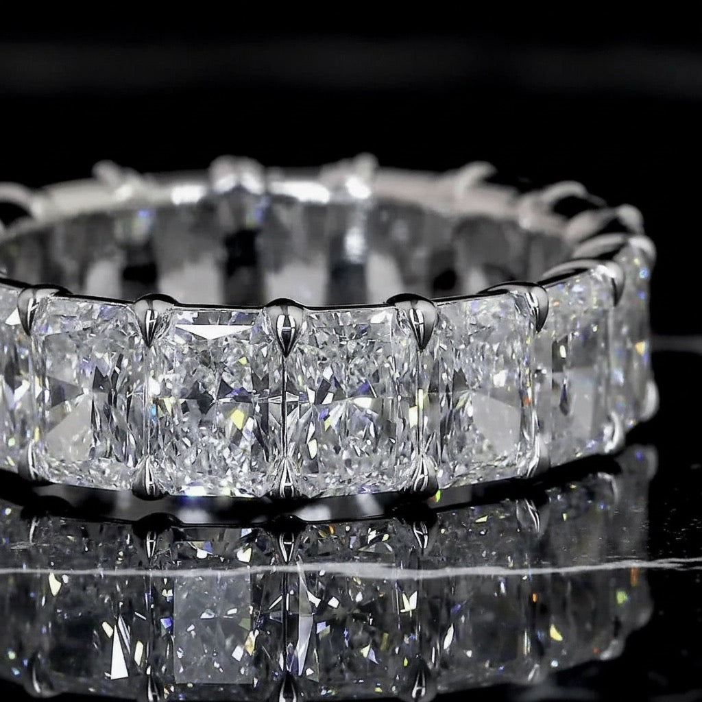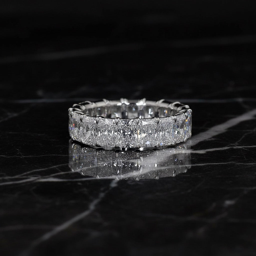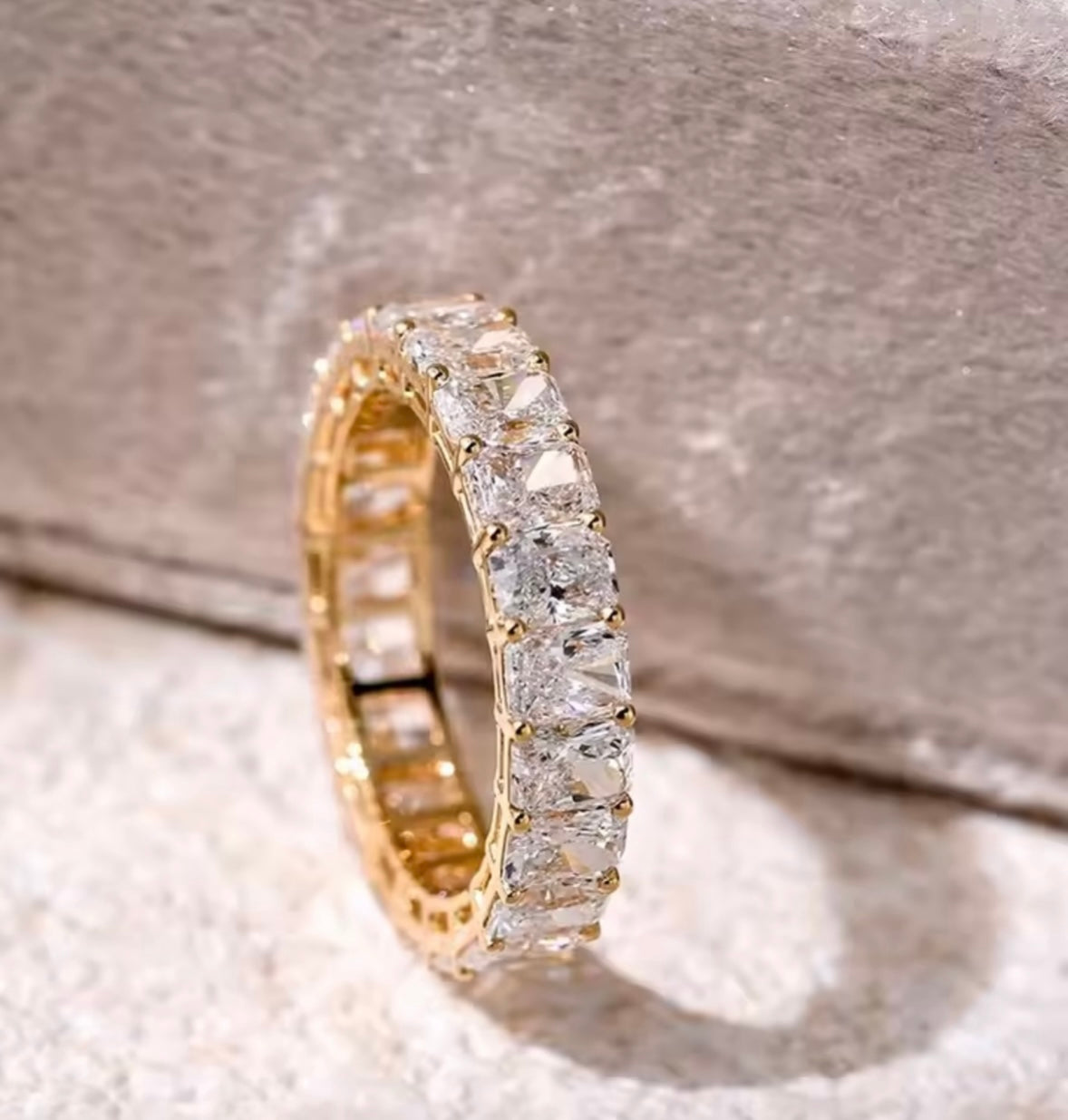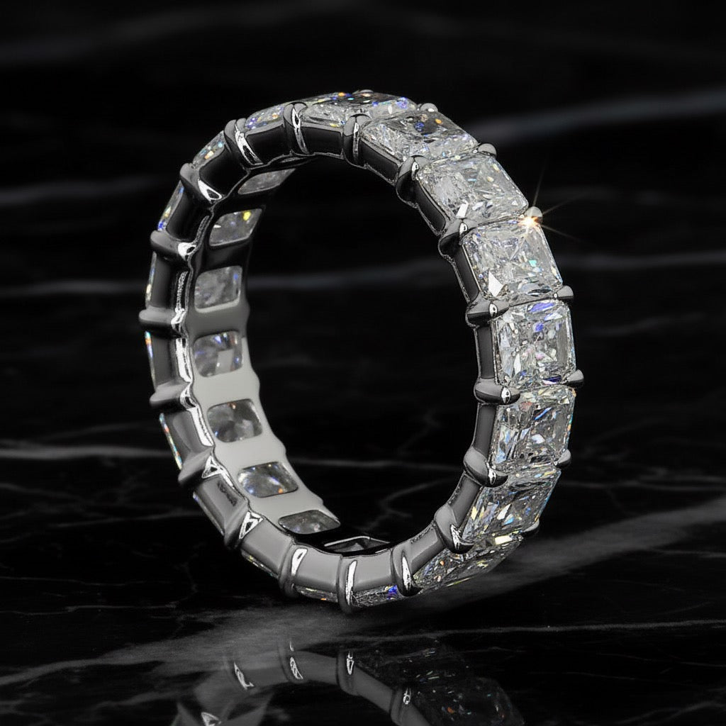 Offered in 14k gold, this exquisite piece showcases a continuous row of radiant-cut diamonds, perfectly set around the entire band for a seamless, luxurious look. The elongated shape of the radiant cut creates a graceful silhouette that catches the light from every angle, ensuring exceptional sparkle and brilliance.