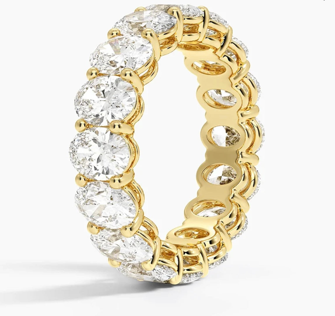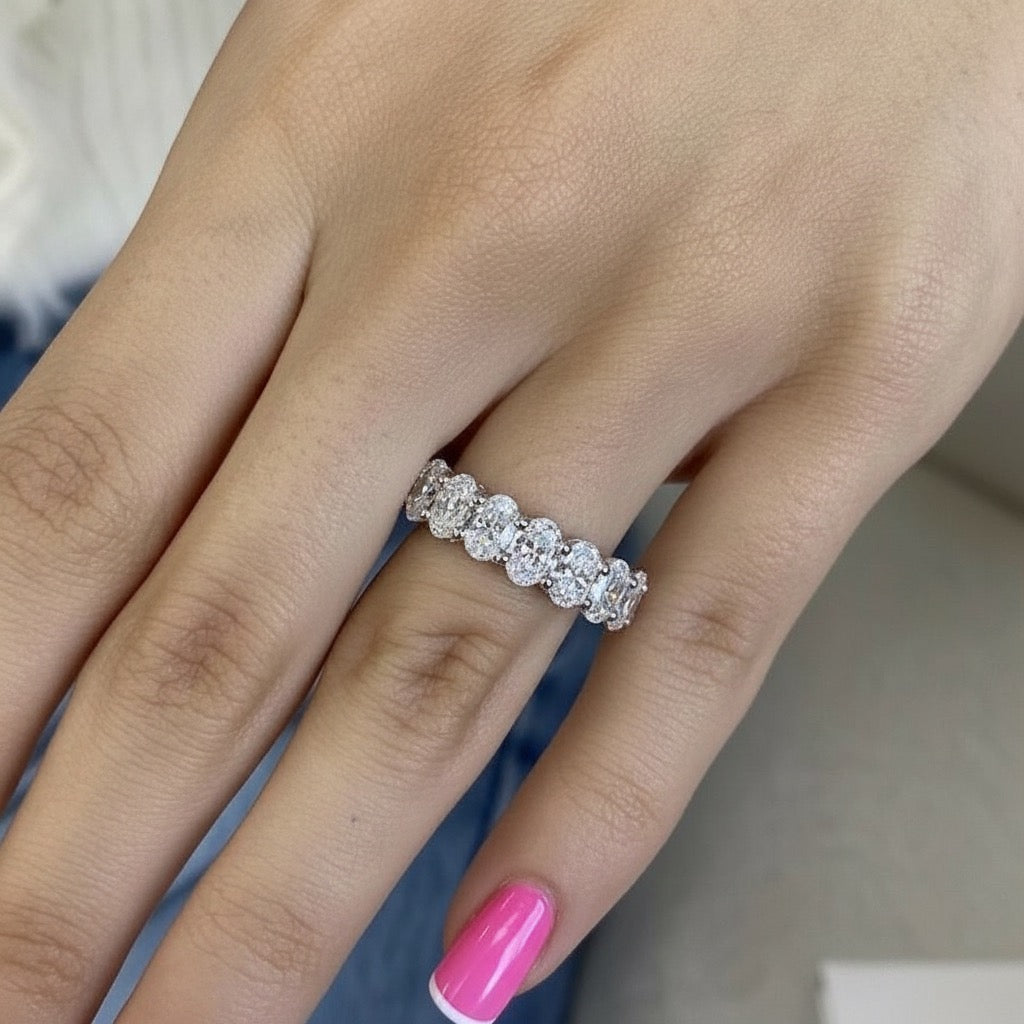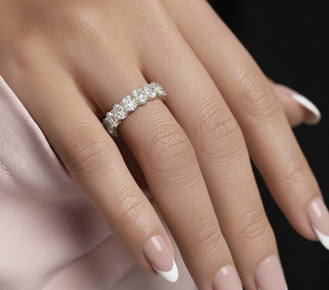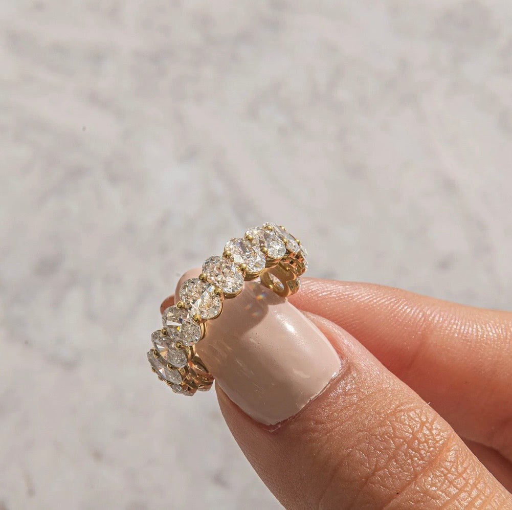 Band: Offered in 14k gold, this pieceΒ features a continuous row of oval-cut diamonds set seamlessly around the band, creating a soft, elongated silhouette that sparkles from every angle. The oval shape enhances brilliance while offering a refined, graceful look that feels both classic and modern. We invite you to reach out to us if you would like pricing for 10k or 18k gold.