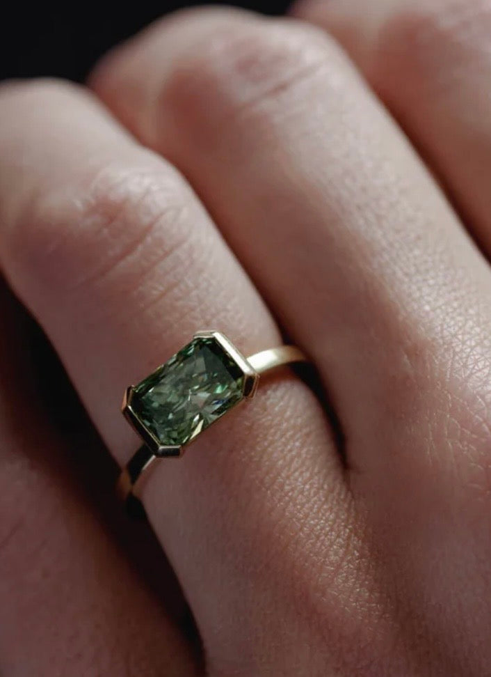 Diamond: Approximately 1.25ct fancy intense green radiant cut in a half-bezel, East-west setting