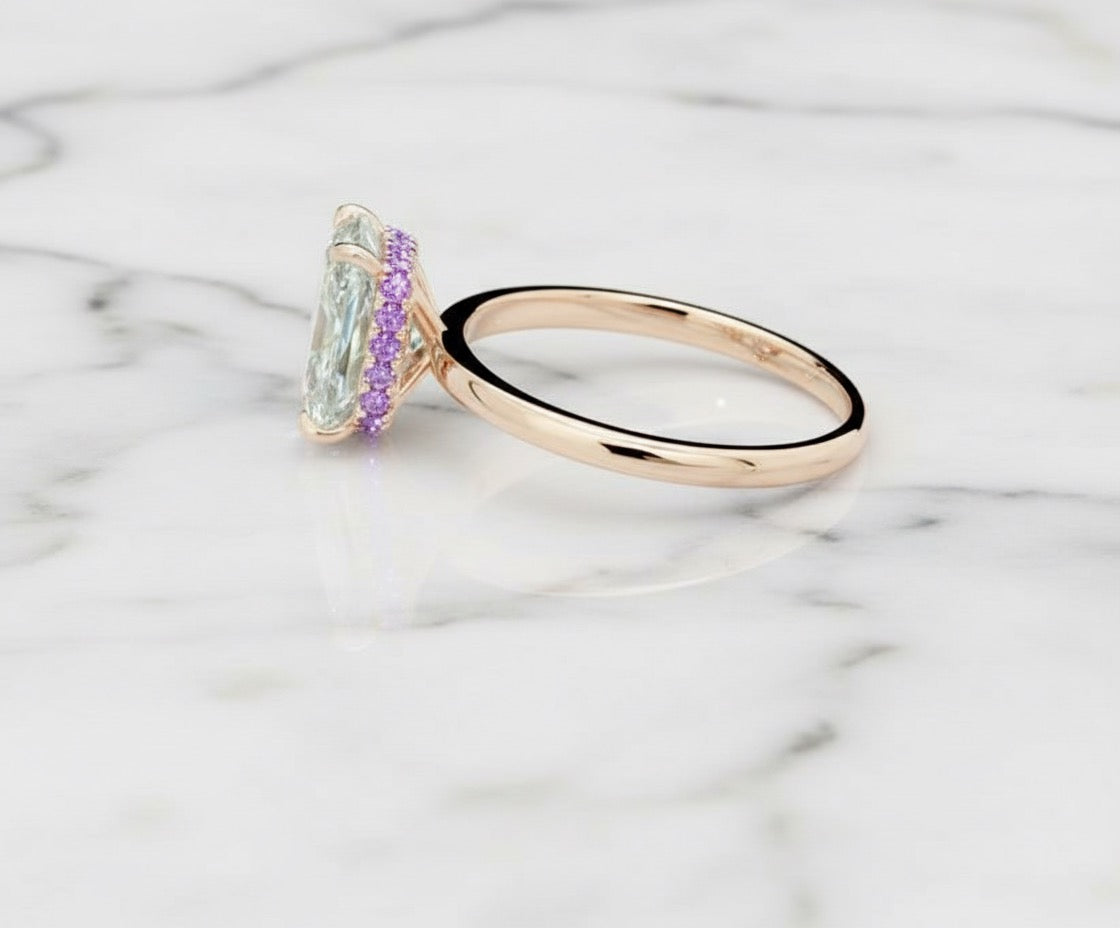 Created to fit any ring size for the ideal, comfortable fit. This setting showcases an elevated solitaire style set on an 18ct gold pavΓ© band. A delicate hidden halo of coloured sapphires adds a personal, romantic touch - bringing a subtle hint of soft colour to the piece.